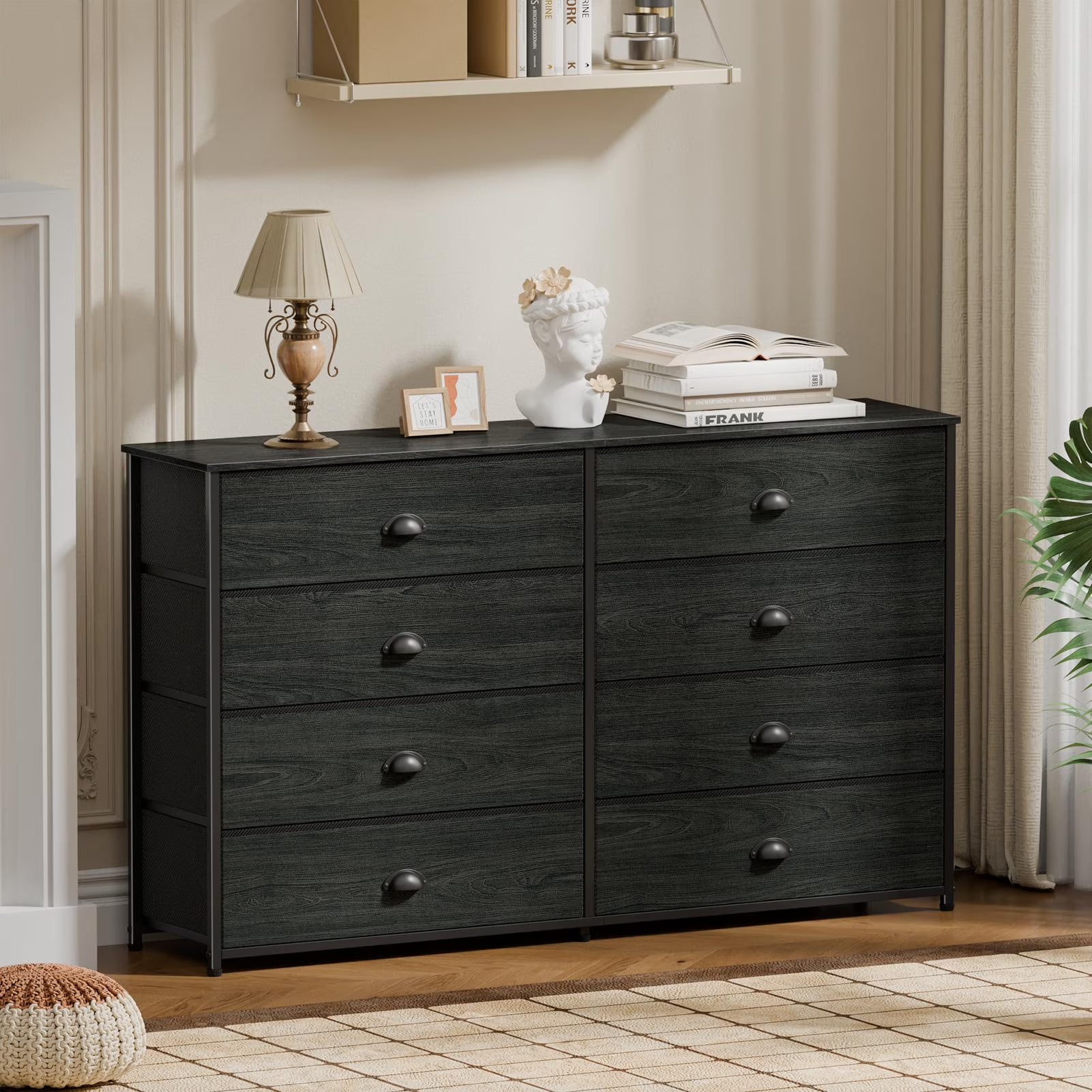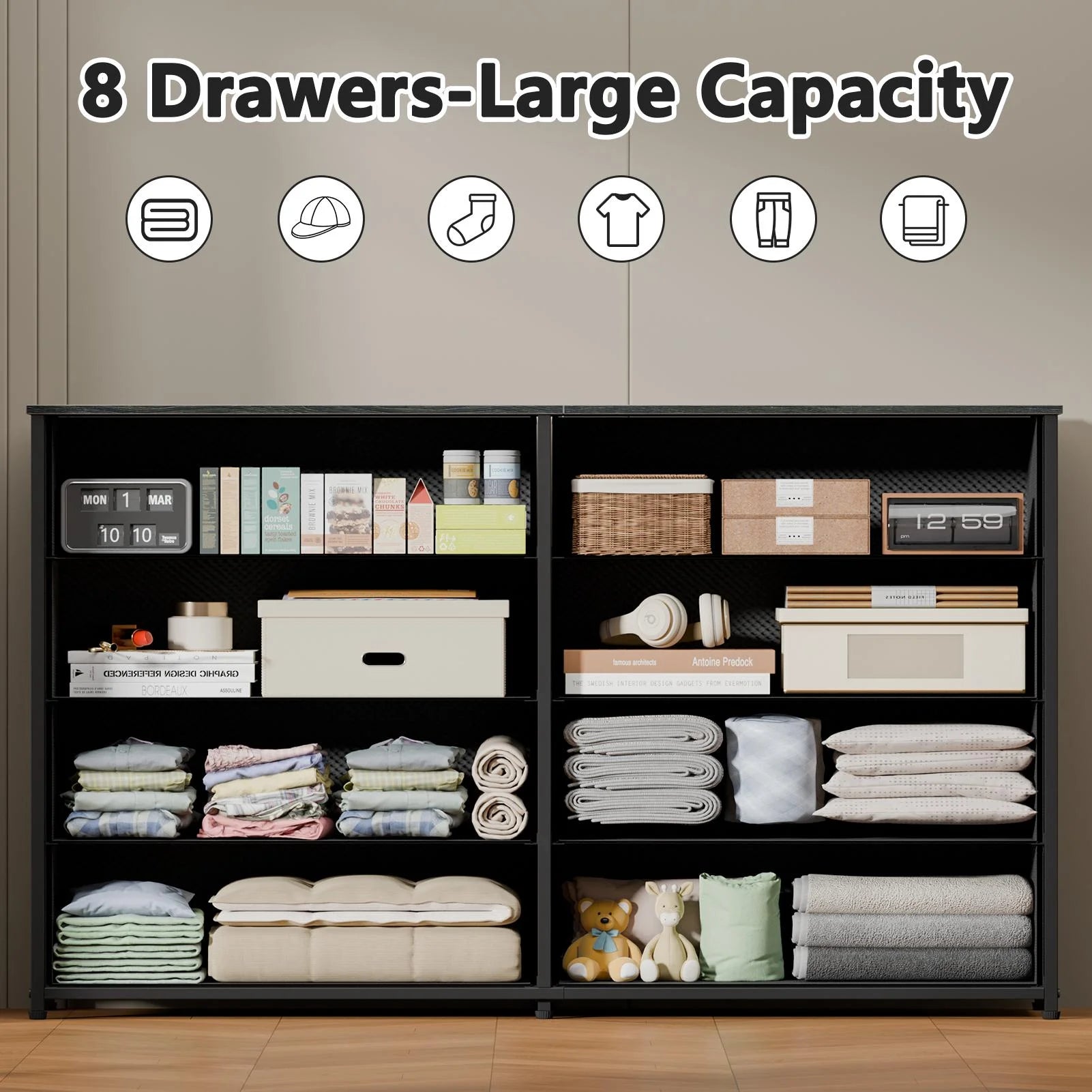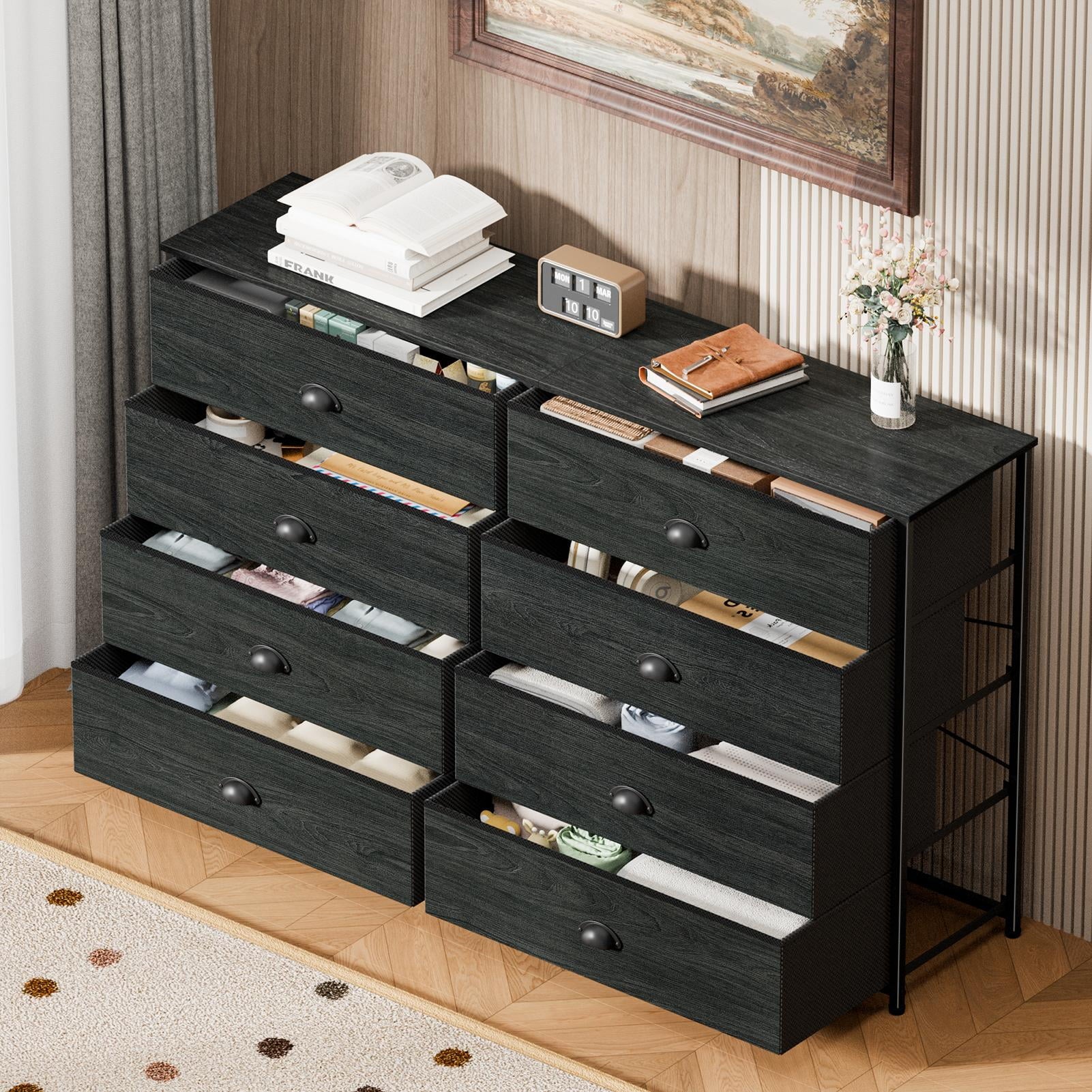 This 8-drawer multifunctional chest seamlessly doubles as a sleek TV stand, masterfully blending modern simplicity with warm, rustic dark wood texture to elevate the aesthetic of your living room or bedroom. It features a sturdy, high-quality wooden desktop—expertly crafted to safely support TVs up to 55 inches, along with small media accessories like remote controls or streaming devices. The eight generously sized fabric drawers offer ample hidden storage for everyday essentials, from linens and books to toys or clothing, while the soft drawer fronts add a gentle touch to the piece’s structured design. Balancing style and practicality, this versatile chest complements various interior decors, making it a functional and visually appealing addition to any home.
