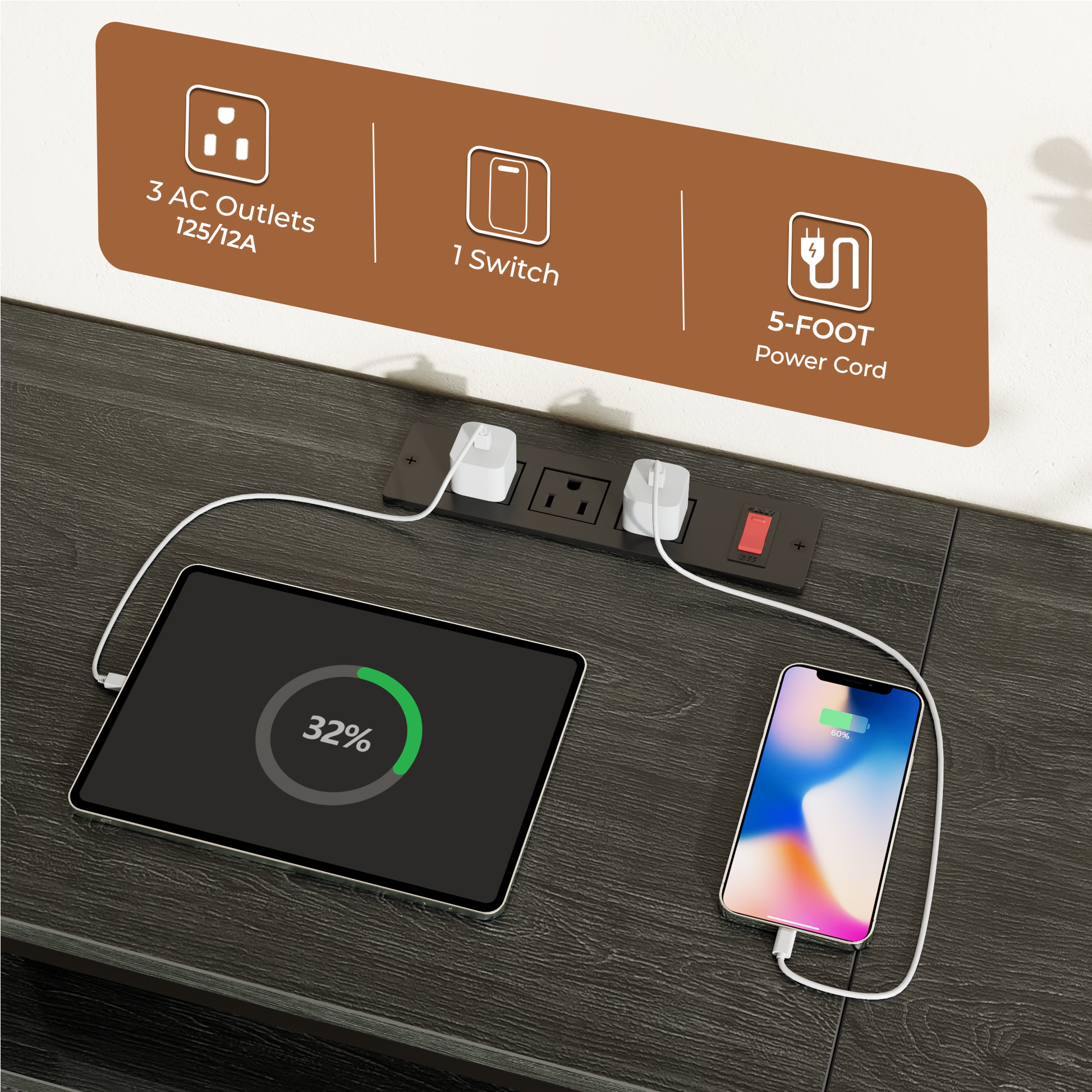 Power Outlets: Features integrated power outlets; powers TVs, soundbars, and media devices directly while eliminating tangled cords, keeping your living room neat and organized