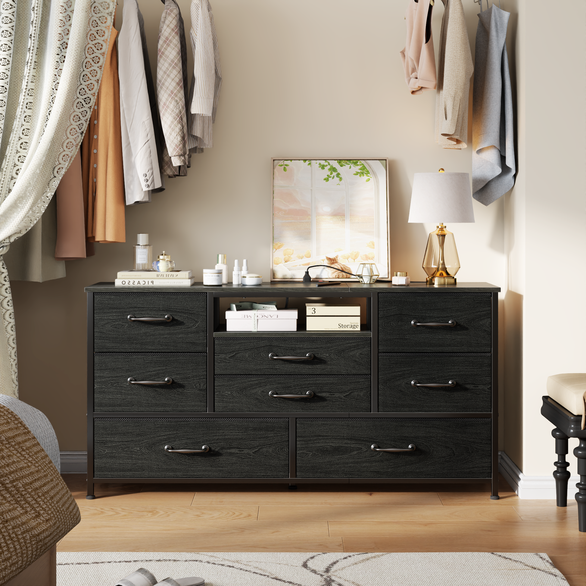 Tydimor TV Stand features a smooth, roomy tabletop that fits TVs up to 55 inches and 8 deep drawers—ideal for stowing remotes, game controllers, messy cables, and daily odds and ends. Power outlets let you plug in your TV, soundbar, or media devices without tangled cords. No more clutter: everything tucks neatly out of sight, keeping your space clean and polished. Built with a sturdy metal frame, it delivers rock-solid stability for your gear—no wobble, just peace of mind. As a versatile Entertainment Center and Media Console, it doesn’t just organize: its finish elevates your space, turning a functional piece into a sleek living room focal point. Don’t wait to level up your home setup—grab this Tydimor gem today! Rest easy: our 24/7 customer service has your back.