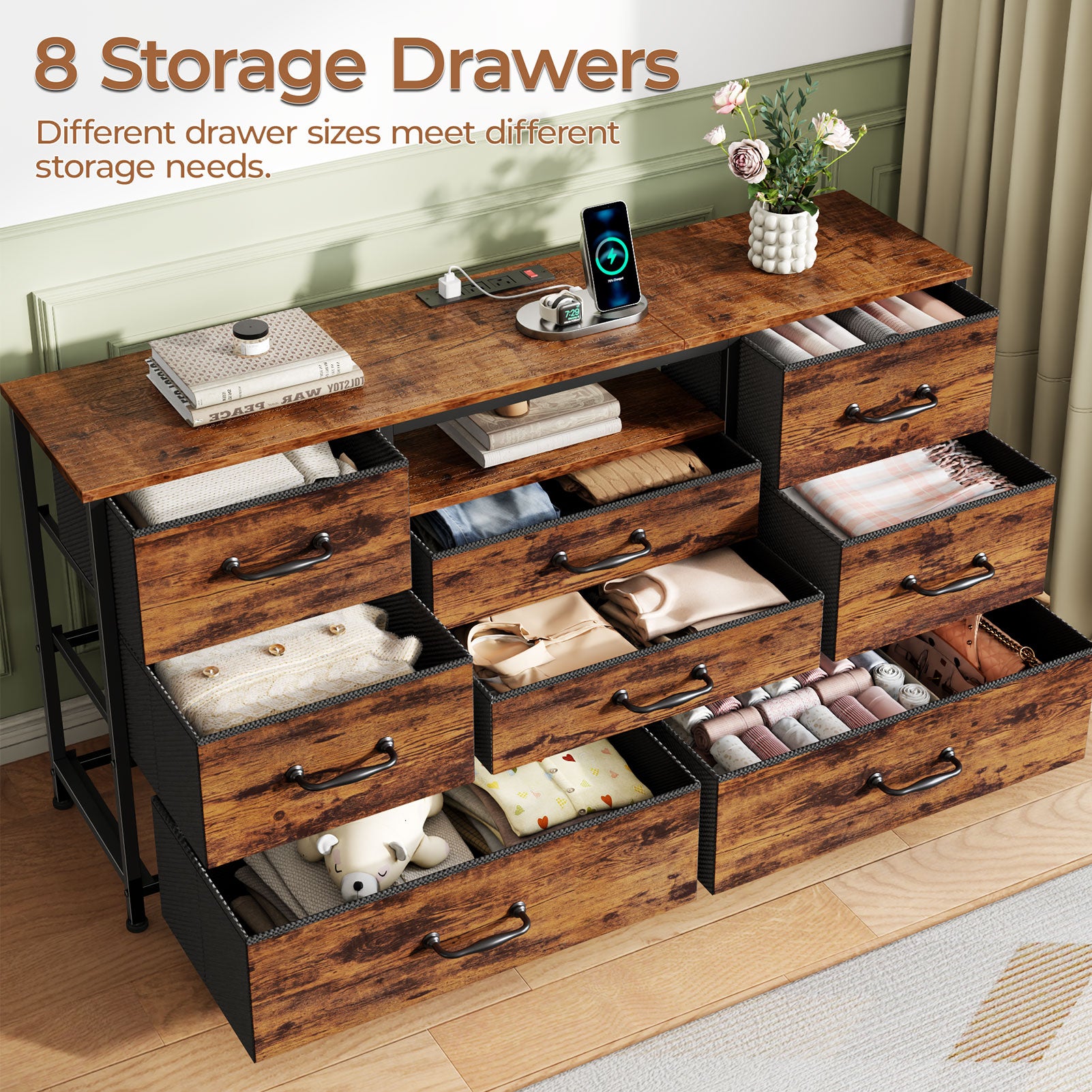 Ample Storage: 8 deep drawers organize remotes, game controllers, messy cables, and daily odds and ends—eliminating clutter for a neat living room
