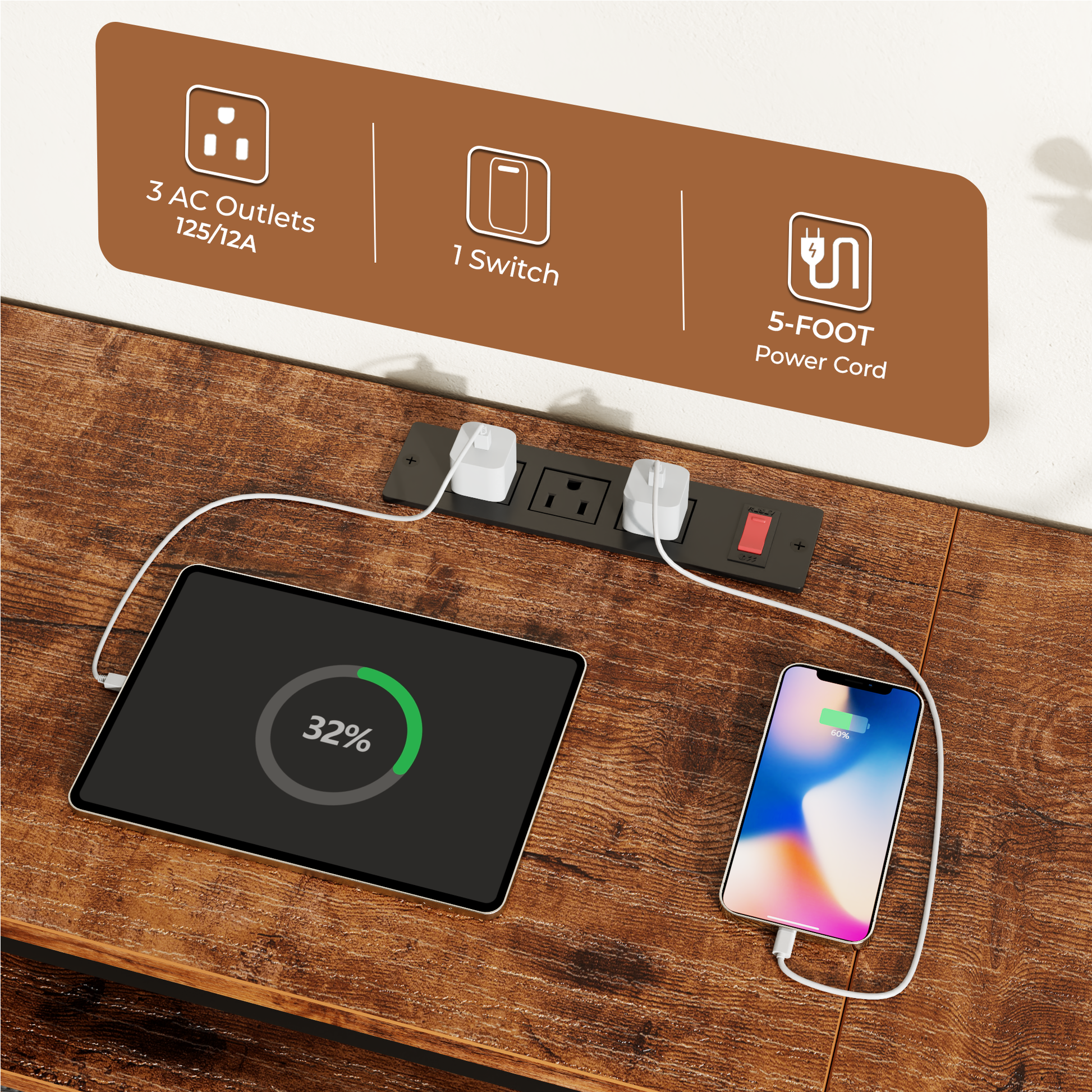 Power Outlets: Features integrated power outlets; powers TVs, soundbars, and media devices directly while eliminating tangled cords, keeping your living room neat and organized