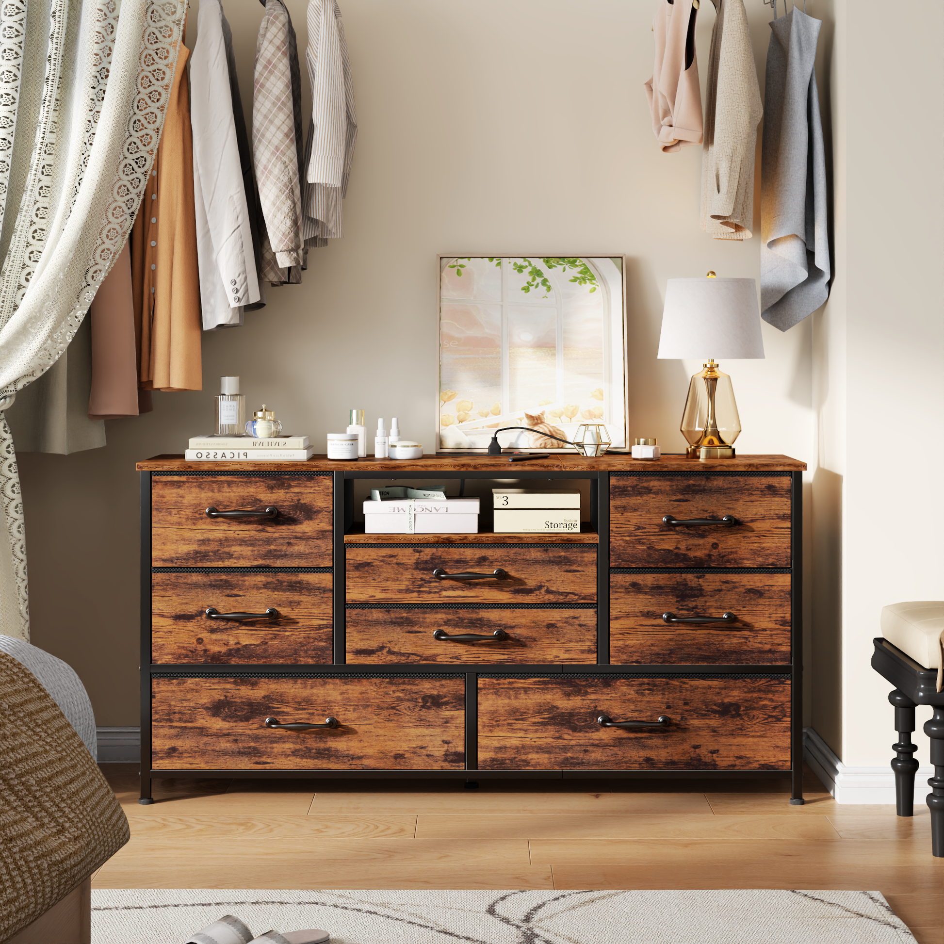Tydimor TV Stand features a smooth, roomy tabletop that fits TVs up to 55 inches and 8 deep drawers—ideal for stowing remotes, game controllers, messy cables, and daily odds and ends. Power outlets let you plug in your TV, soundbar, or media devices without tangled cords. No more clutter: everything tucks neatly out of sight, keeping your space clean and polished. Built with a sturdy metal frame, it delivers rock-solid stability for your gear—no wobble, just peace of mind. As a versatile Entertainment Center and Media Console, it doesn’t just organize: its finish elevates your space, turning a functional piece into a sleek living room focal point. Don’t wait to level up your home setup—grab this Tydimor gem today! Rest easy: our 24/7 customer service has your back.