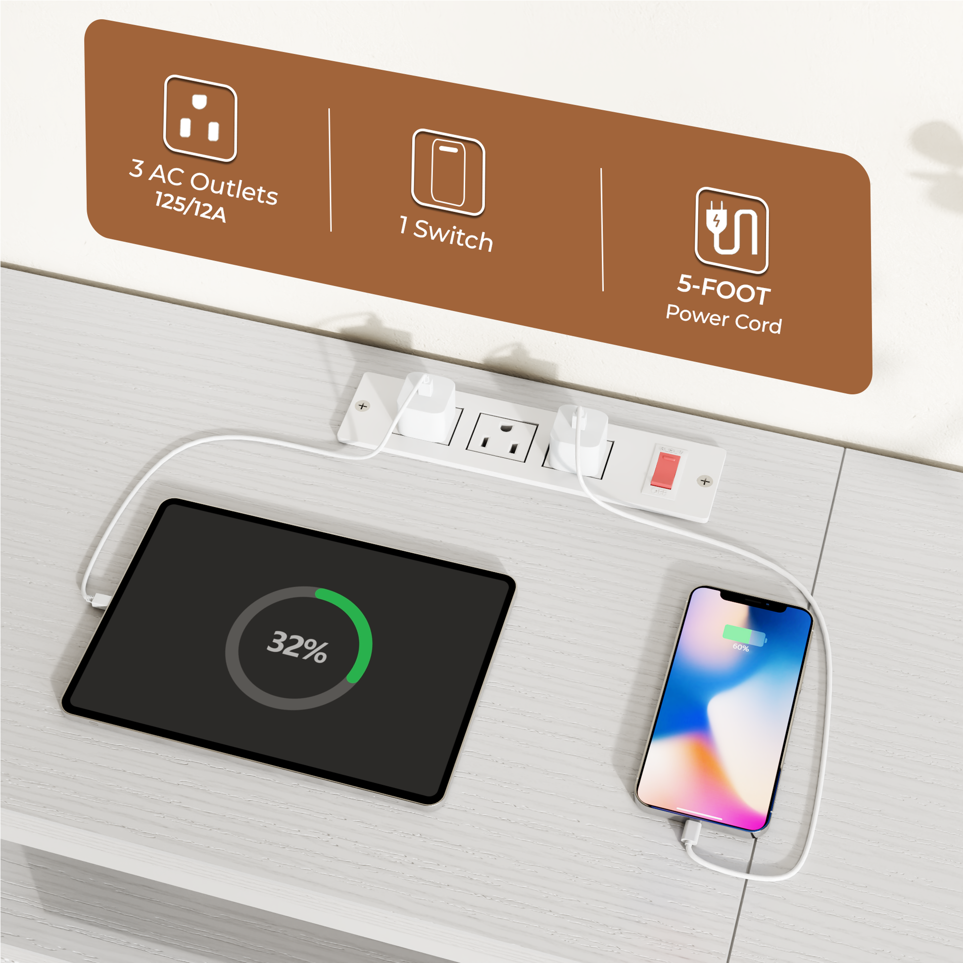 Power Outlets: Features integrated power outlets; powers TVs, soundbars, and media devices directly while eliminating tangled cords, keeping your living room neat and organized