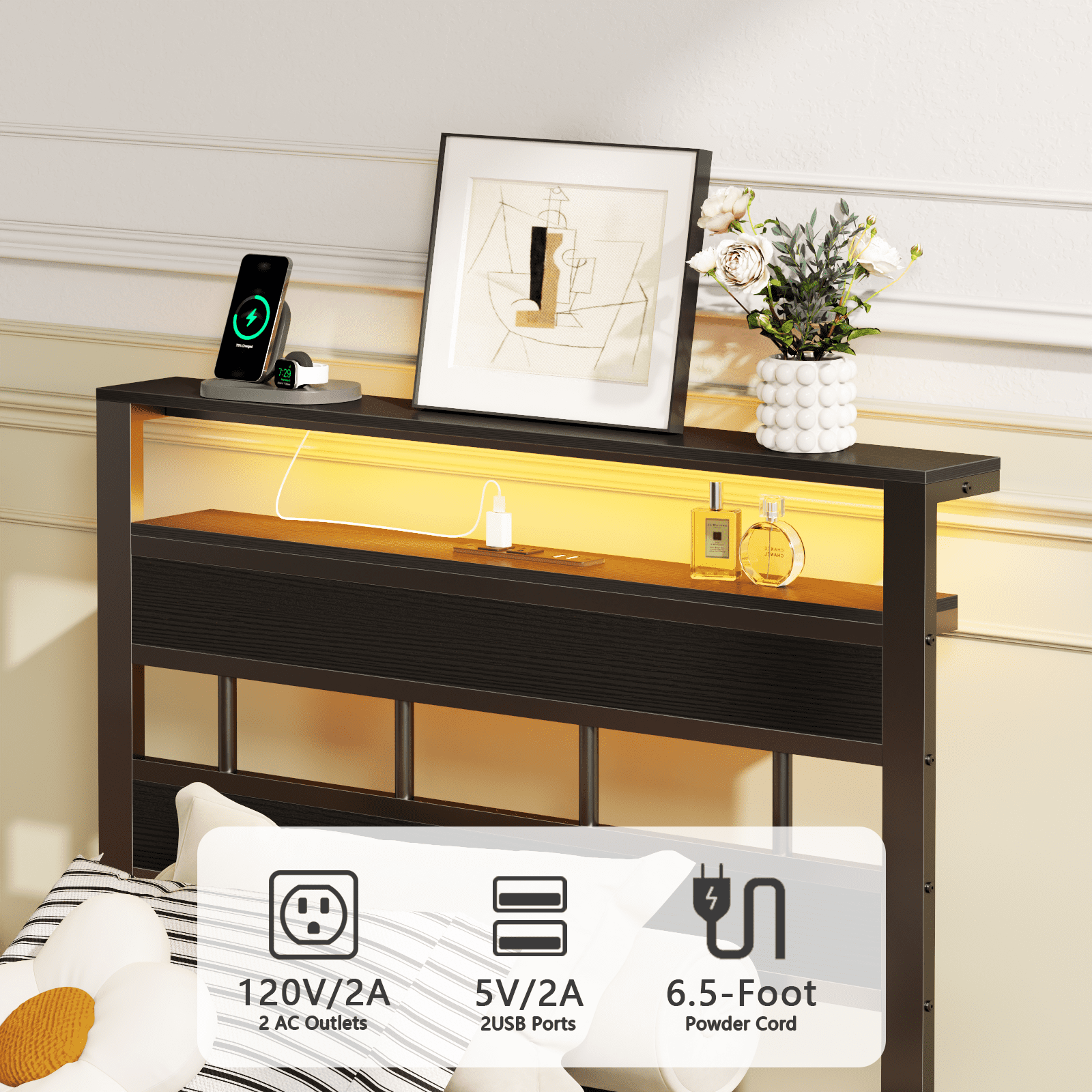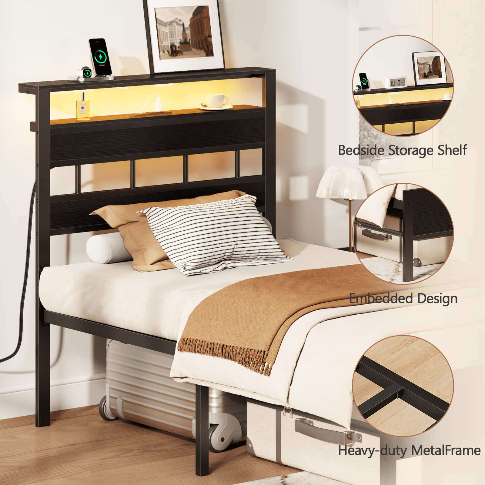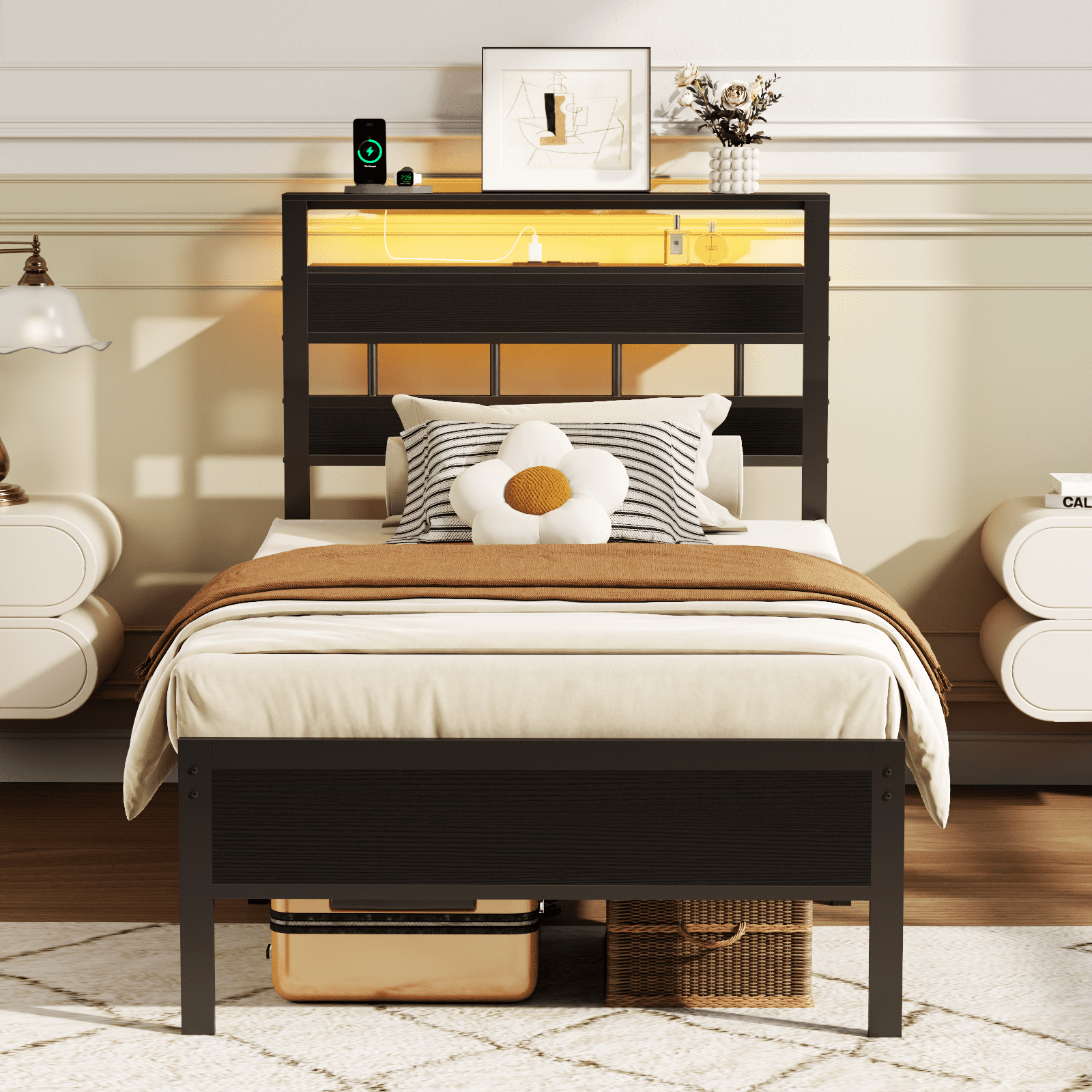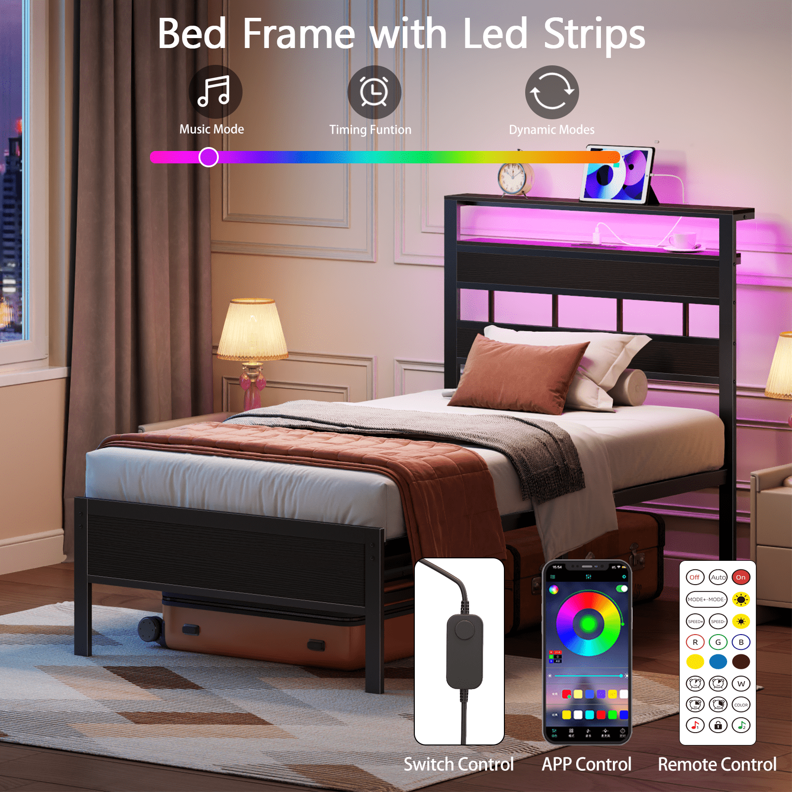 Tydimor Twin Bed Frames with USB Ports and Outlets, LED Gaming Bed Metal Frame Underbed with Headboard, Niose Free
