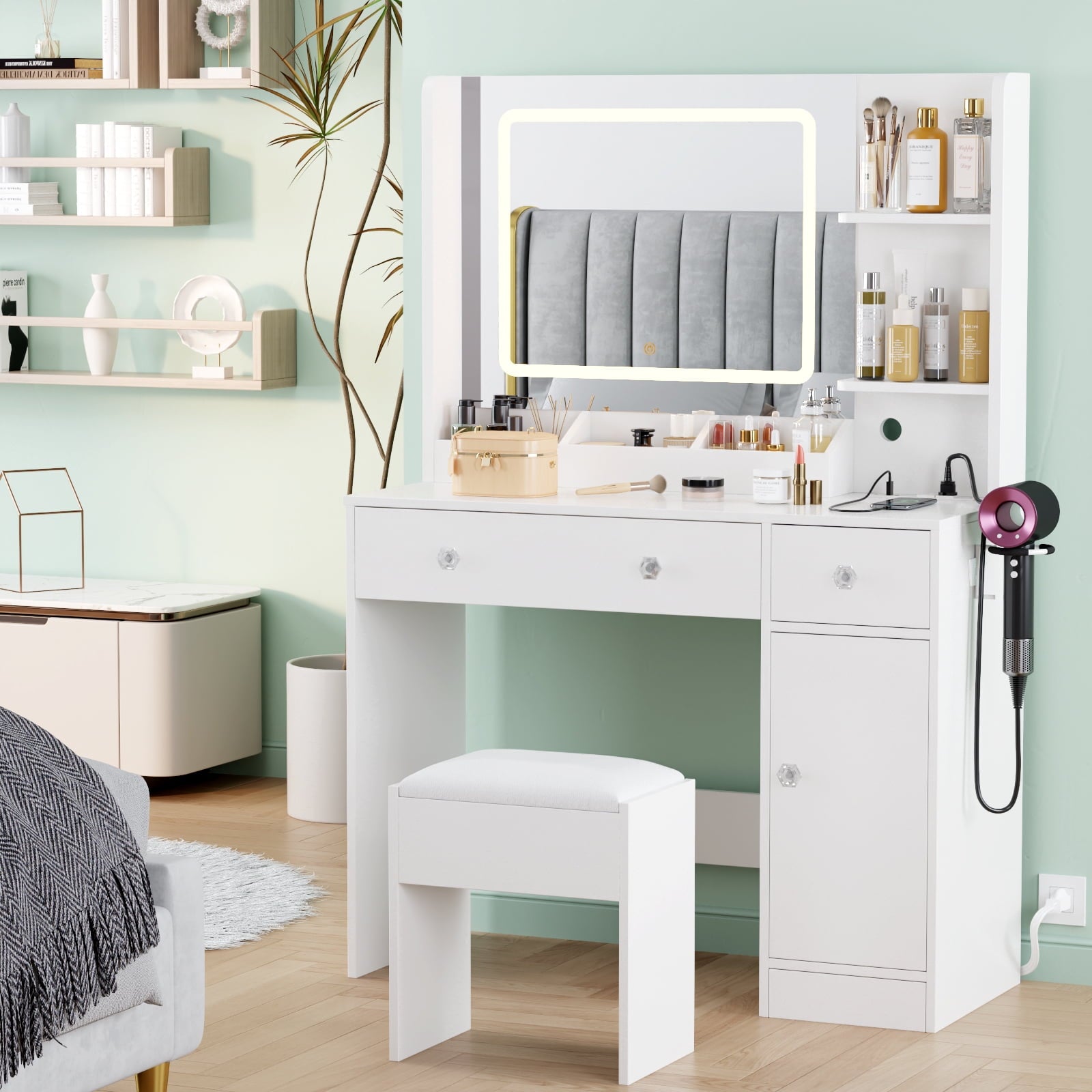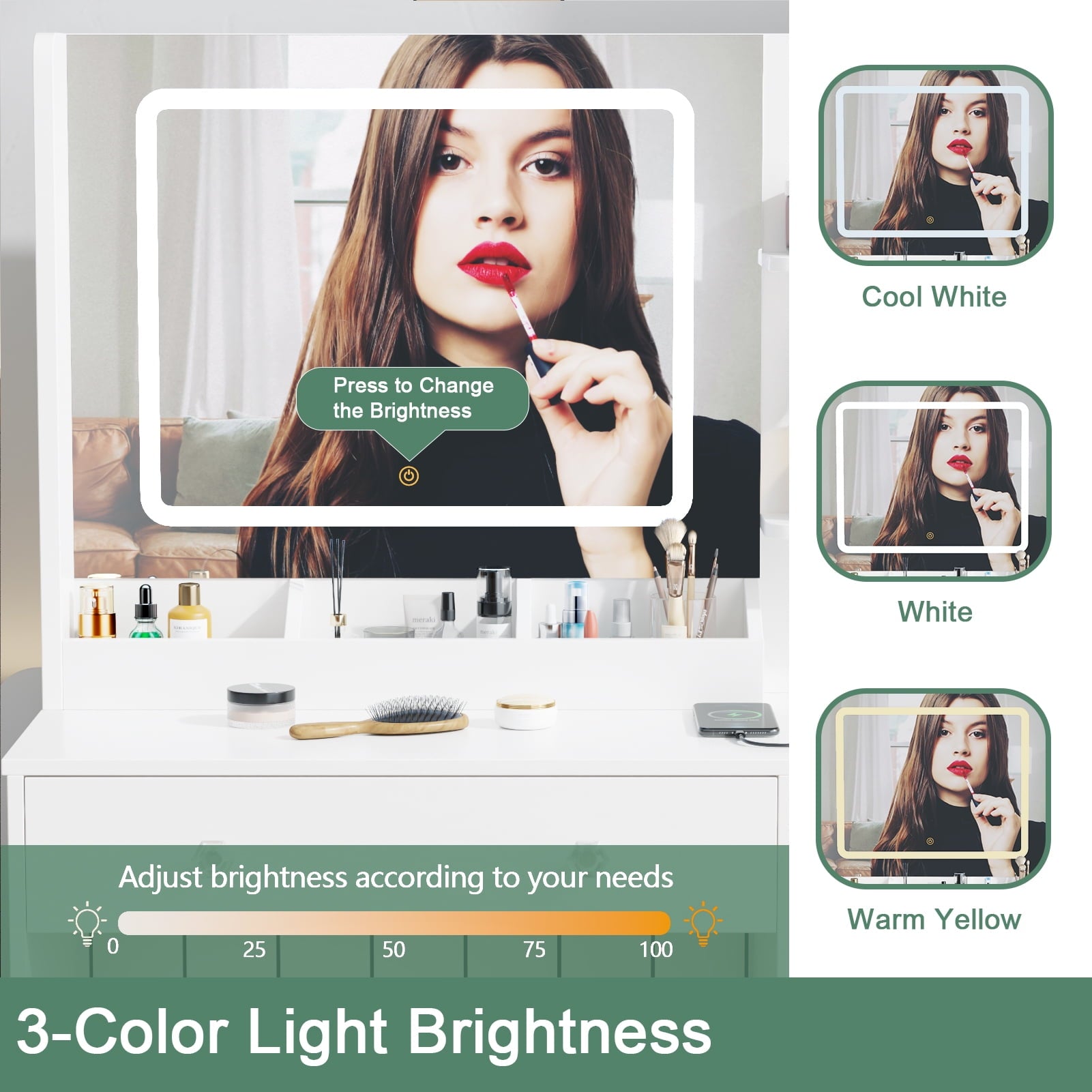 Tydimor Vanity Set with Mirror & Lights, Women Makeup Table with Charging Station, Sturdy Dressing Desk with Drawers & Stool
