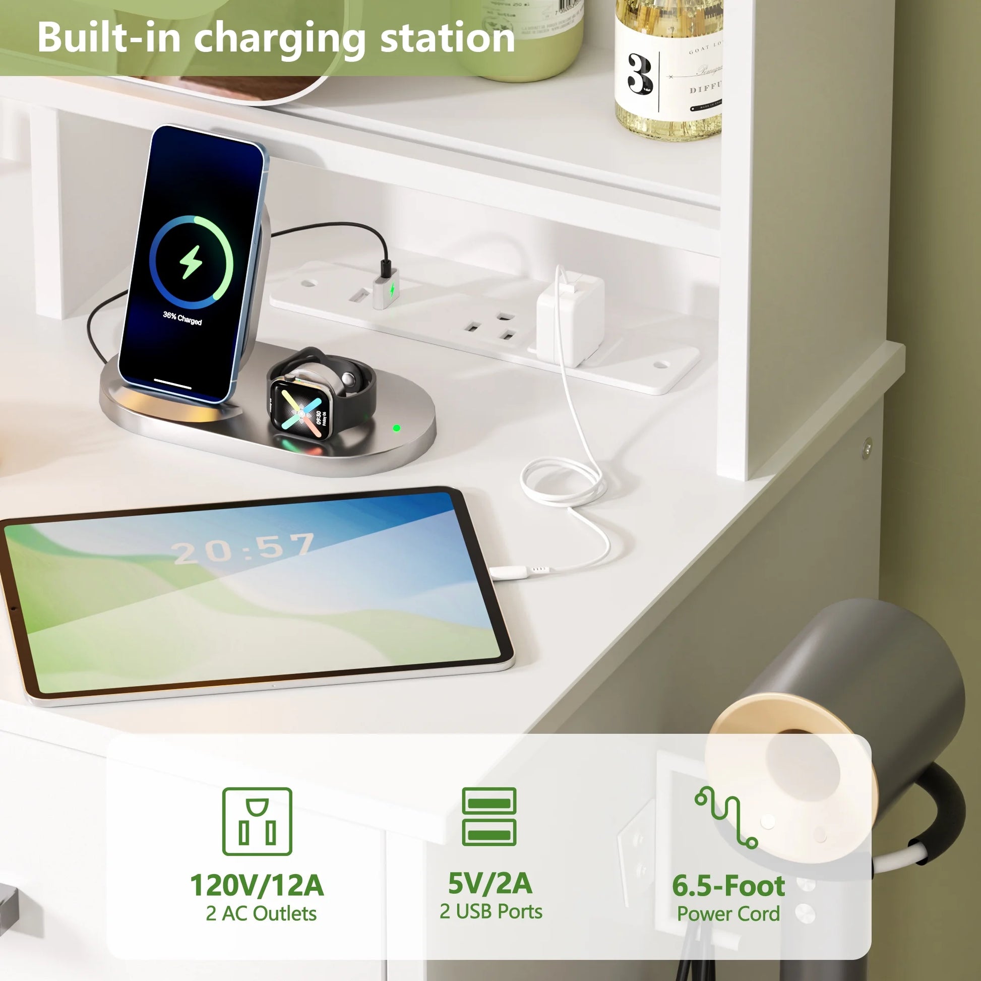 Built-In Charging Station: Equipped with 2 USB ports and 2 power outlets, this adult vanity desk provides convenient charging for hair tools, beauty devices, and mobile phones, allowing for multiple devices to be used simultaneously